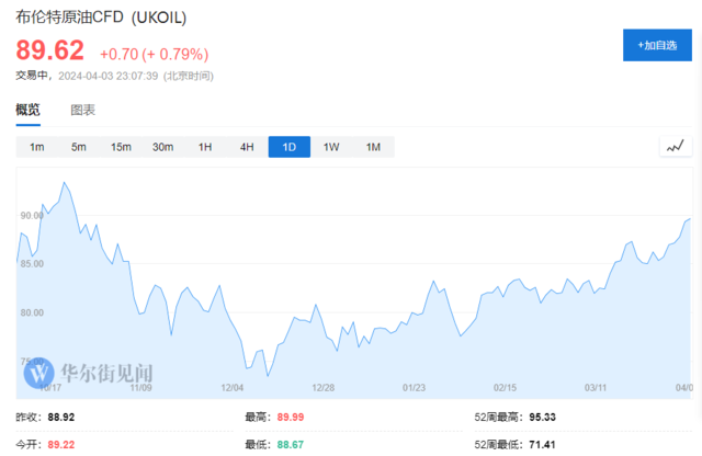 周三晚间,在OPEC+组织确认继续维持减产策略后,布伦特原油价格延续涨势并攀升至近90美元,创近五个月新高。