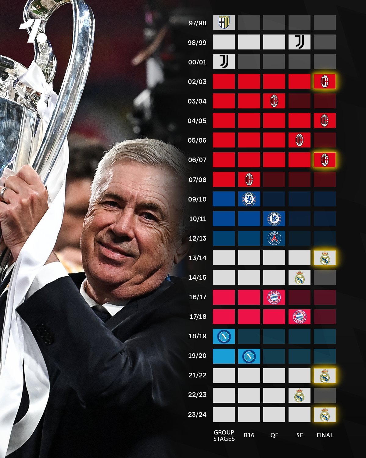 安切洛蒂的欧冠之路 六次决赛只有一次没拿下🐶